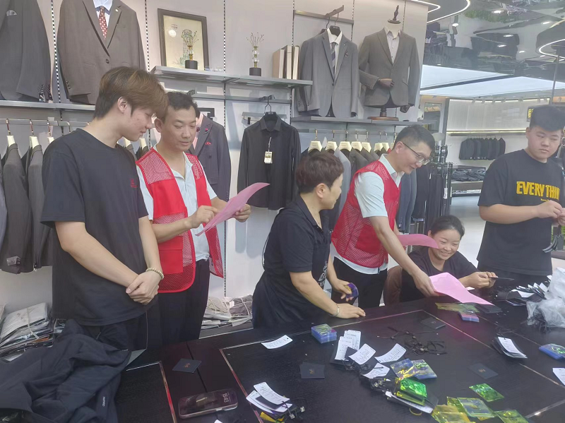 隨后,黨員們深入錢塘衣城各商戶,發(fā)放防汛知識手冊。他們結(jié)合“7·20”特大暴雨真實案例,向商戶現(xiàn)場講解預(yù)警信號含義、暴雨洪澇危害及自救互救方法,提醒大家務(wù)必增強汛期安全意識,提前做好防范措施。
