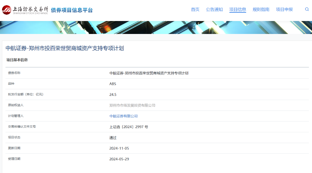 鄭州市投百榮世貿(mào)商城資產(chǎn)支持專項(xiàng)計(jì)劃獲上交所通過