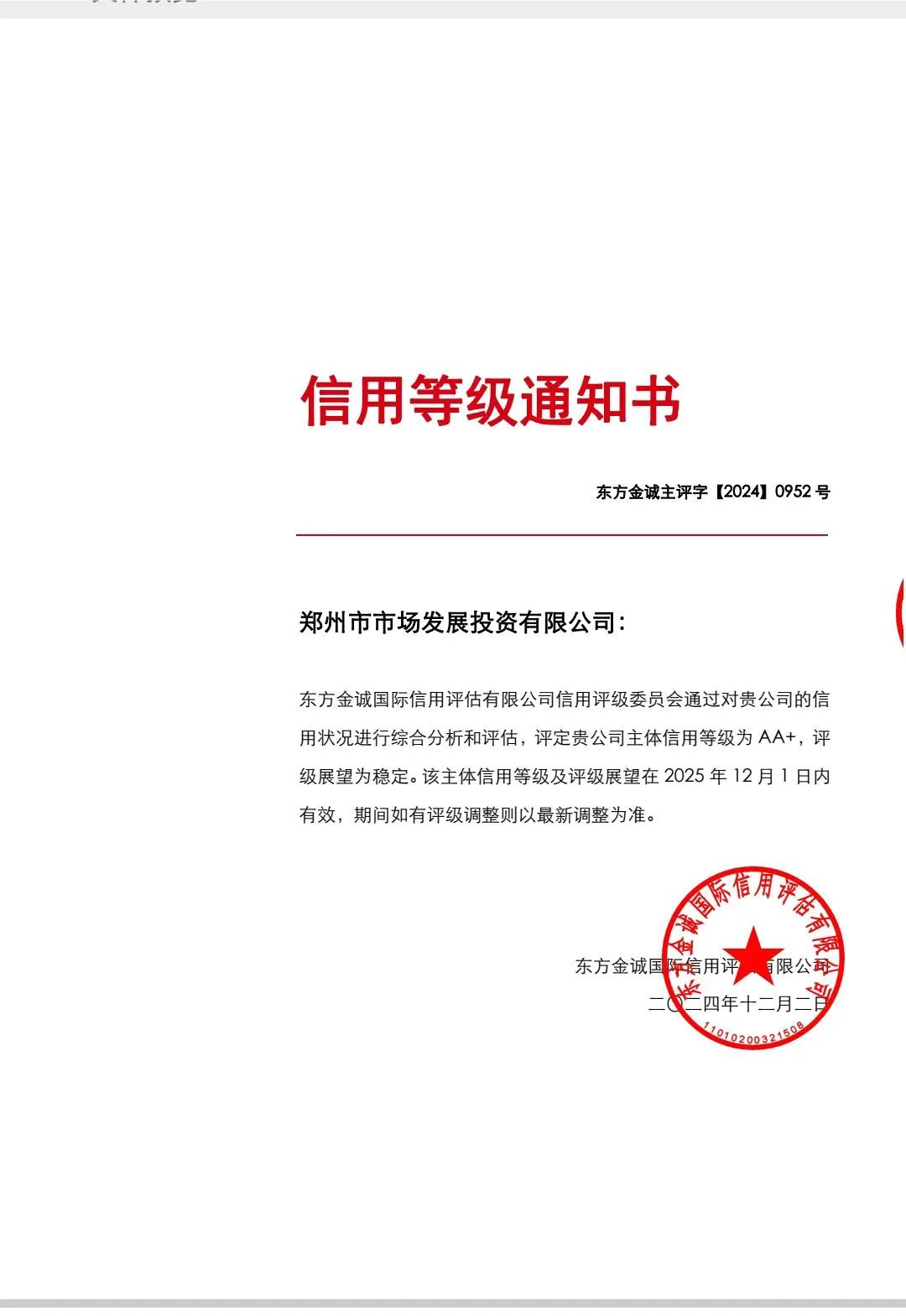 近日,鄭州市市場發(fā)展投資有限公司獲得國內(nèi)權(quán)威評級機構(gòu)東方金誠國際信用評估有限公司AA+主體信用評級,評級展望為“穩(wěn)定”。